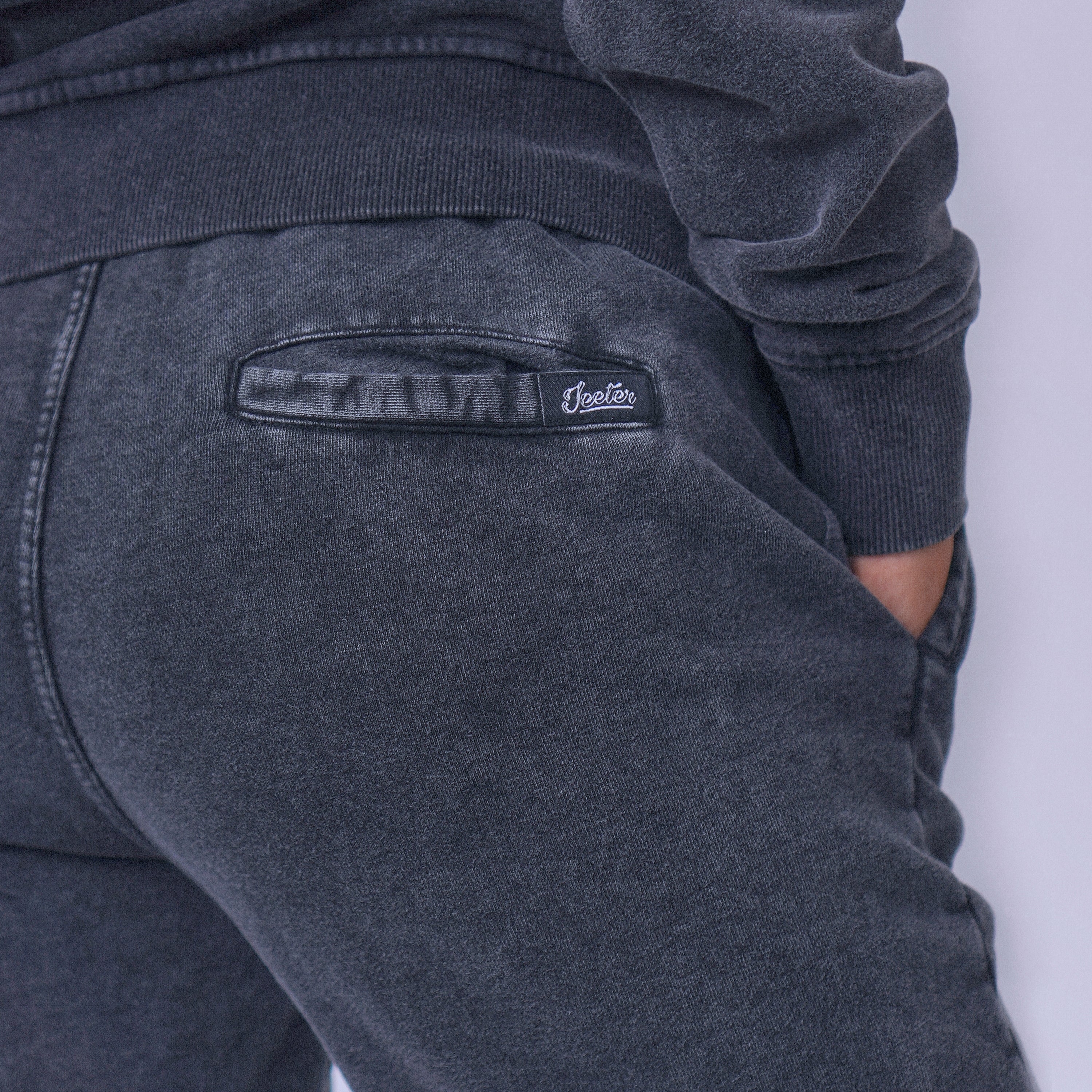Unisex pull on shorts in loopback French terry with a heavy patina, garment-dyed "Sun-fade" wash. This dye process creates a distinct high and low color effect and ensures no two shorts are the same. This item features our corded drawcords with hand-wrapped thread and an acetate-dipped knot finish. It also features our San-serif Jeeter embroidery at center front.